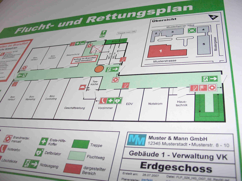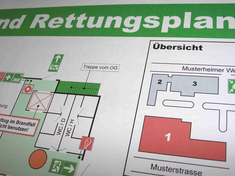Flucht- und Rettungspläne sind vorbeugend aber auch im Brand- oder Katastrophenfall eine wichtige Informationsquelle. Sie beinhalten den Standort des Betrachters, alle Lösch- und Rettungseinrichtungen, Erste-Hilfe-Einrichtungen und den Verlauf der Flucht- und Rettungswege ins Freie oder in den nächsten, sicheren Brandabschnitt. Zusätzlich ist das Verhalten im Brandfall oder bei Unfällen integriert und der Sammelplatz in einer Objektübersicht klar gekennzeichnet. Die dargestellten Symbole werden anhand einer Legende erklärt.