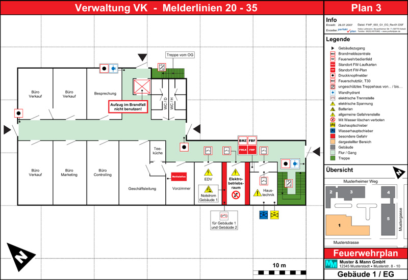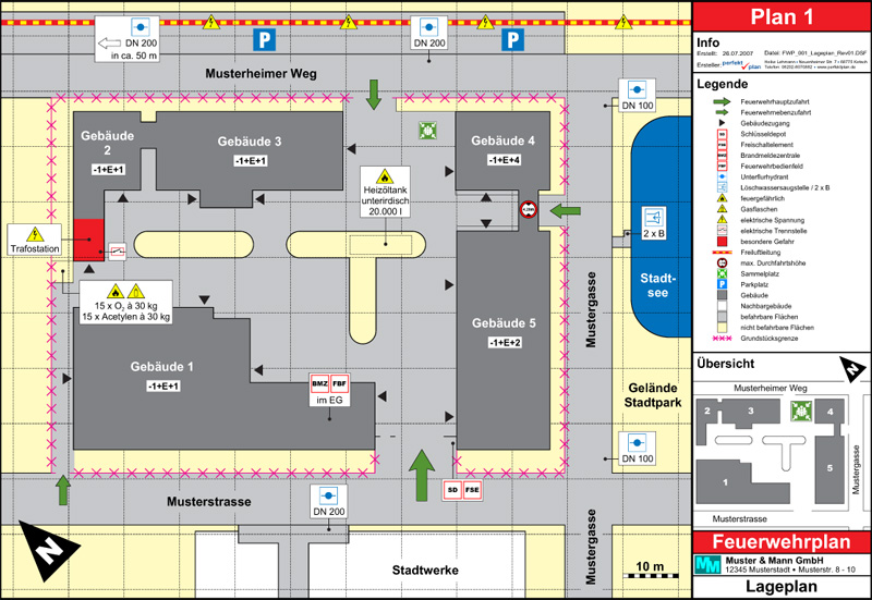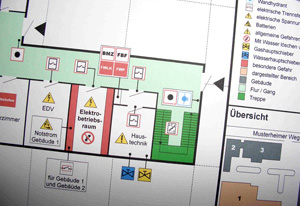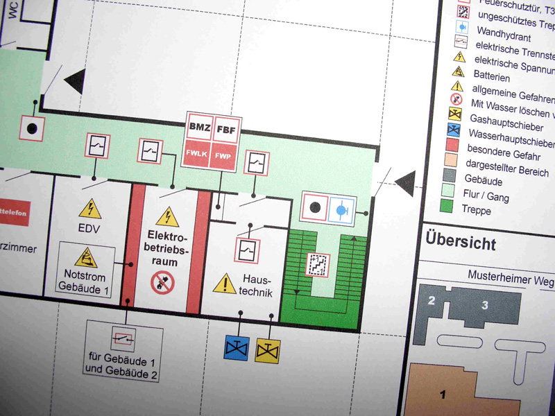 Feuerwehrpläne beinhalten alle wichtigen Informationen einer baulichen Anlage, die für einen erfolgreichen Einsatz der Feuerwehr im Alarmfall erforderlich sind. Die Einsatzleitung der Feuerwehr kann mit Feuerwehrplänen bereits auf dem Weg zum Unfallort alle notwendigen Entscheidungen treffen. Direkt vor Ort kann dann die Feuerwehrmannschaft ohne unnötige Zeitverzögerung ihren Einsatz durchführen.