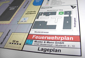Unsere Feuerwehrpläne sind übersichtlich aufgebaut, schnell erfassbar und mit klaren und leicht verständlichen Texten und Normsymbolen hinterlegt. Die Abstimmung der Pläne mit den Behörden und der Feuerwehr übernehmen wir für Sie. Natürlich beschaffen wir auch alle erforderlichen Freigaben. Wir drucken die Feuerwehrpläne im digitalen Druckverfahren UV-stabil und wasser-resistent und schützen sie zusätzlich mit Prospekthüllen. Auf schwer zu handhabendes und leicht brüchig werdendes Laminat können Sie getrost verzichten. Damit sind unsere Feuerwehrpläne bestens für den Feuerwehreinsatz geeignet.